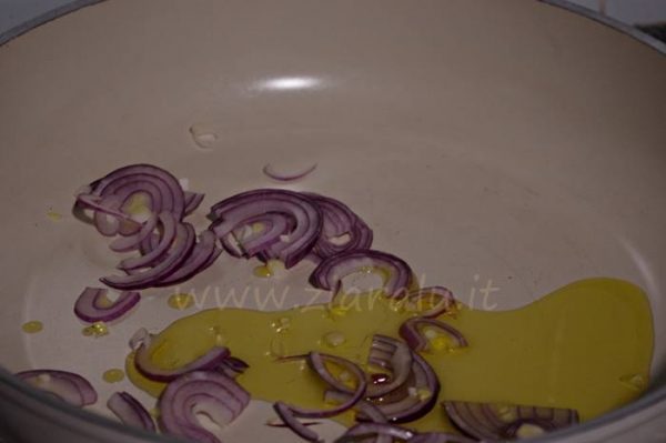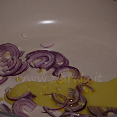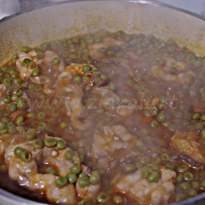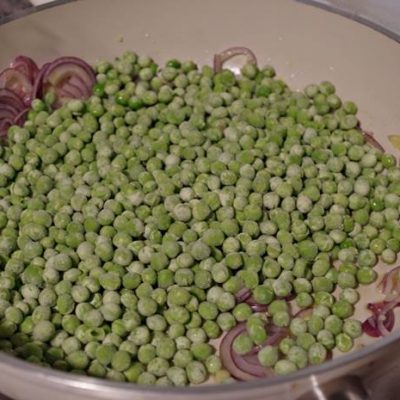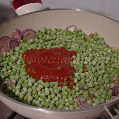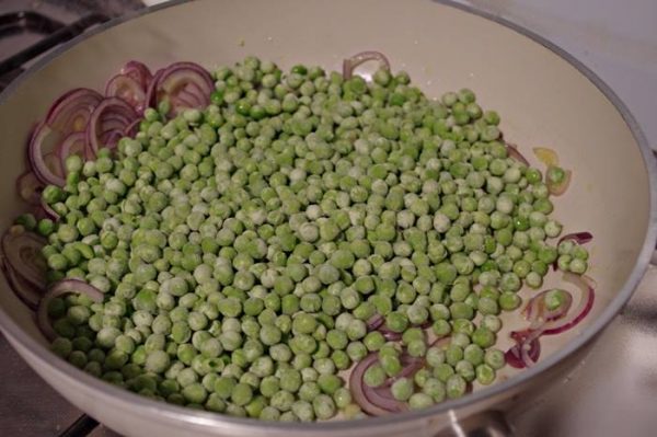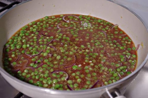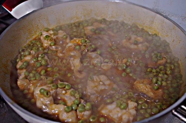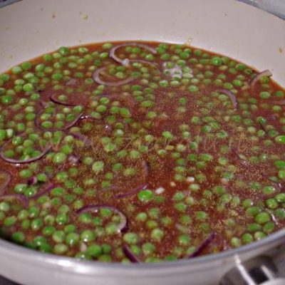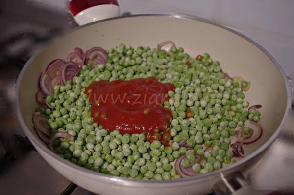 In una padella versate due cucchiai di olio evo insieme al pezzo di cipolla tagliata a fettine sottili. Fate cuocere per qualche minuto facendo attenzione a che la cipolla non si bruci. Aggiungete ora i piselli e i cucchiai di salsa di pomodoro. Versate nella padella tanta acqua che copra i piselli. A me è stata necessaria 200 ml.