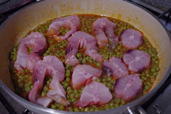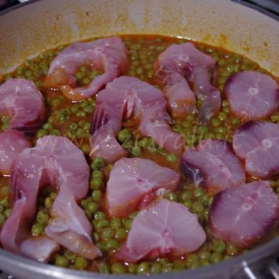 Ed ecco qua che il vostro palombo con piselli e pomodoro alla romana è pronto