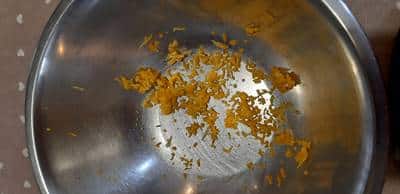 Lavate intanto il limone e grattugiatene solo una metà della buccia lasciandola cadere in una ciotola. Dalla restante metà potrete ricavare delle striscioline di buccia per la decorazione del piatto.