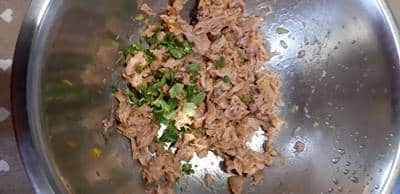 Aggiungete nella ciotola il tonno sgocciolato, il prezzemolo e poco sale.