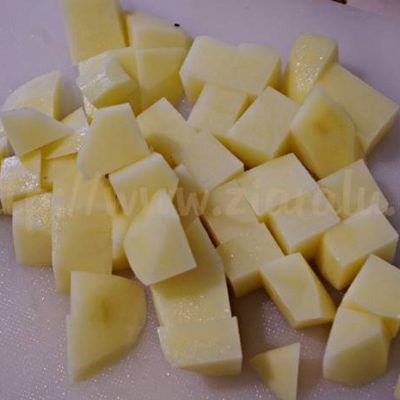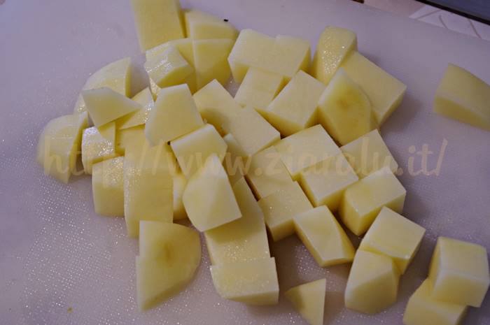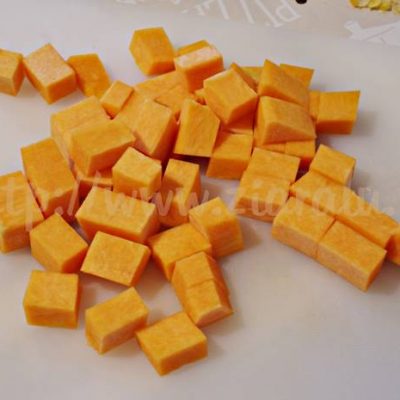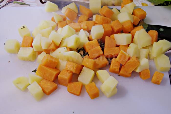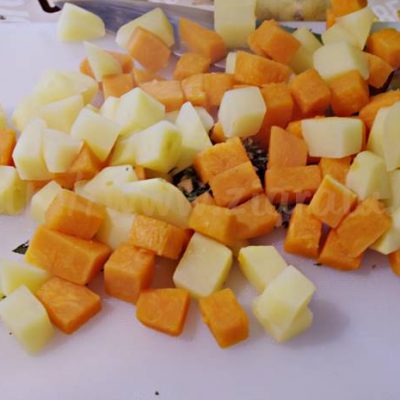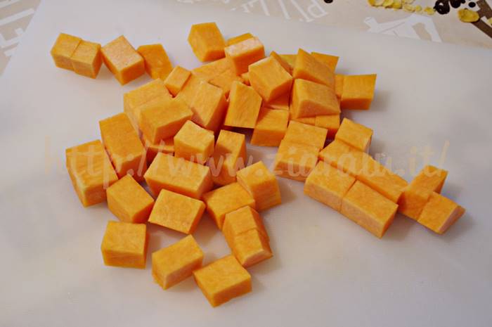 Innanzi tutto sbucciate le patate e tagliatele a cubetti. Tagliate a cubetti anche la polpa della zucca. Cercate ovviamente di fare cubetti della stessa dimensione così cuoceranno uniformemente.