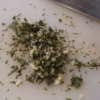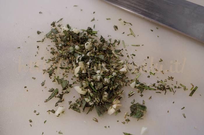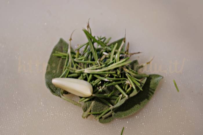 Lavate salvia e rosmarino e tritateli bene insieme all’aglio.