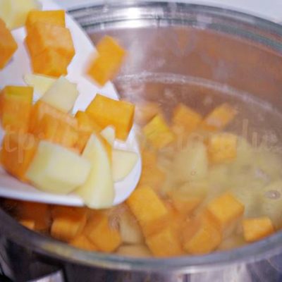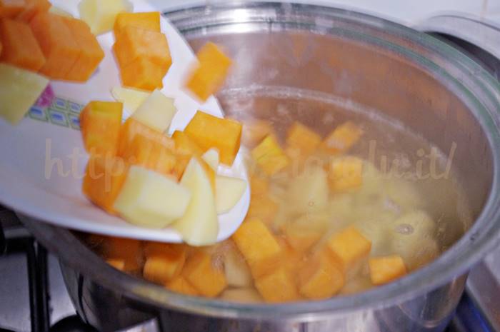 Riempite di acqua una pentola e metteteci i cubetti di patate e zucca. Portate a bollore e fate bollire qualche minuto.