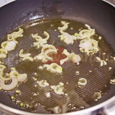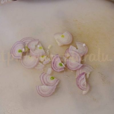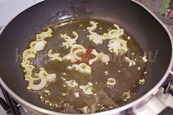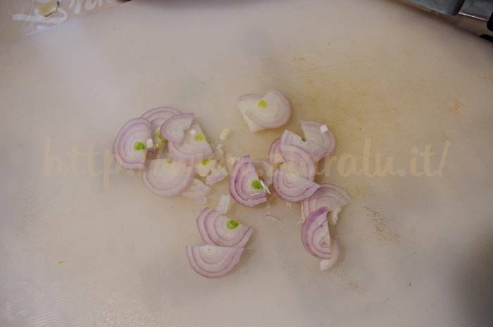 Tagliate lo scalogno a fettine sottili e fatelo cuocere in un tegame o una ampia padella che possa contenere anche il riso, con un cucchiaio di olio evo.