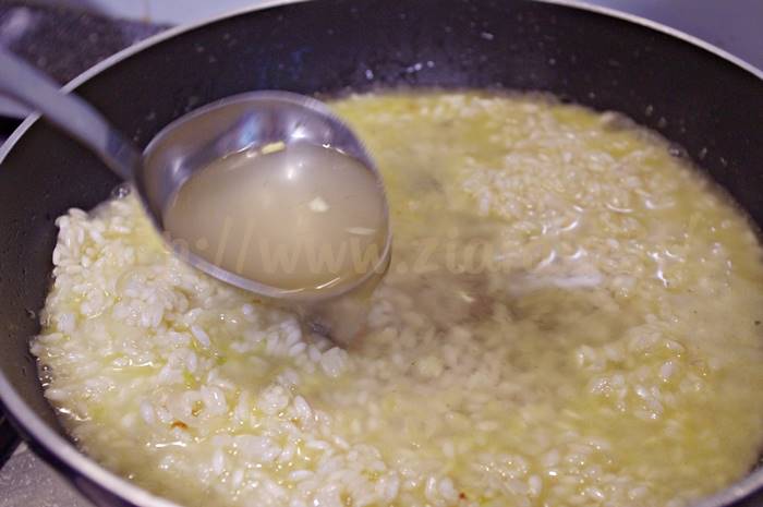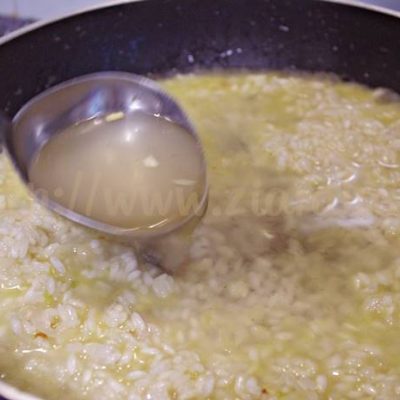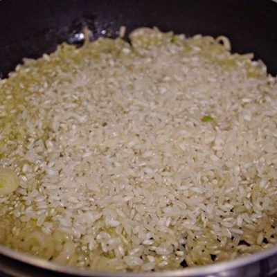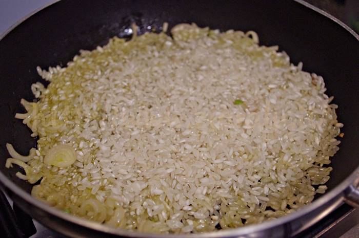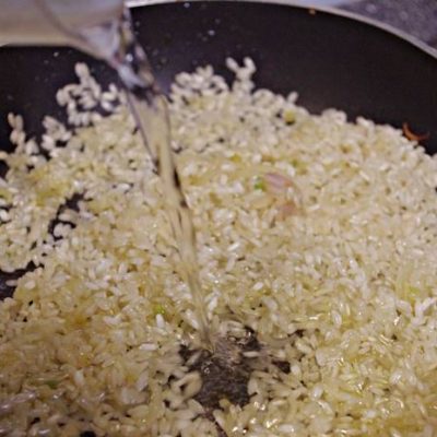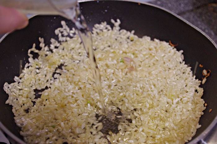 Aggiungete il riso, fatelo tostare qualche minuto poi bagnatelo con il vino bianco secco. Fate sfumare il vino e poi aggiungete il brodo vegetale un mestolo alla volta e mescolare spesso.