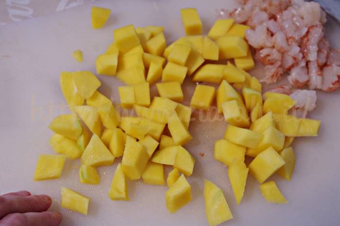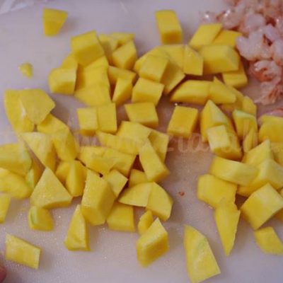 Iniziate sbucciando il mango e togliendo il nocciolo centrale. Pesate il mango che vi serve e poi tagliatelo a dadini.