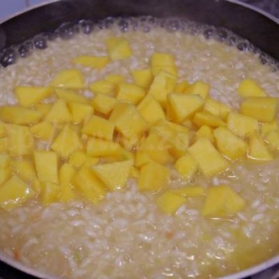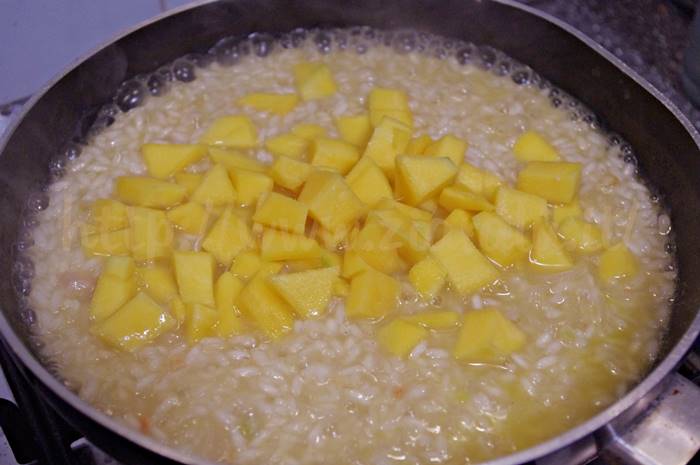 Considerando la cottura totale del riso indicata nella confezione, a metà cottura unite la dadolata di mango.