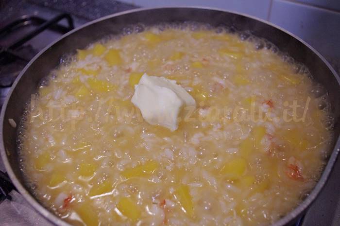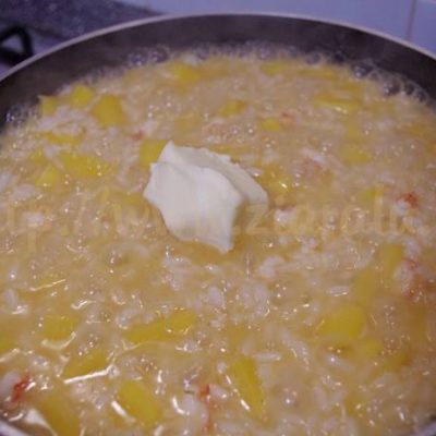 Continuate a far cuocere il riso e aggiungete anche i gamberoni a pezzetti. Quando il riso sarà cotto versare nel tegame il burro e fate mantecare il tutto.