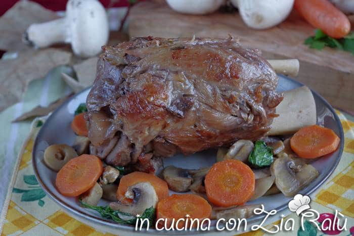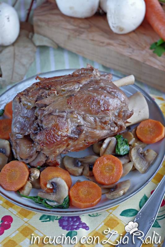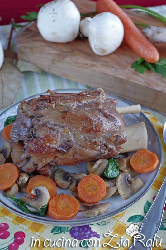 Lasciate restringere il sughetto di cottura e servite ogni stinco irrorato del sughetto e accompagnato da un contorno di insalata mista o di funghi e carote in padella come ho fatto io.