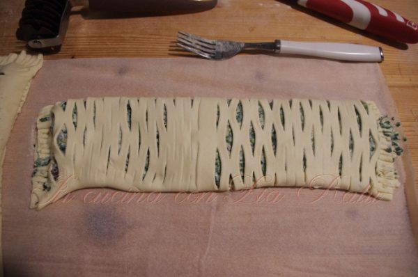 Con un rullo tagliapasta per crostate tagliate la parte opposta a dove avete messo il ripieno lasciando due centimetri dal bordo. Sovrapporre la pasta tagliata al ripieno fino a chiudere lo strudel. Aiutandovi con una paletta larga (io ho usato una paletta da pasticcere) spostate lo strudel sulla teglia e spennellatene la superficie con l’albume precedentemente sbattuto.