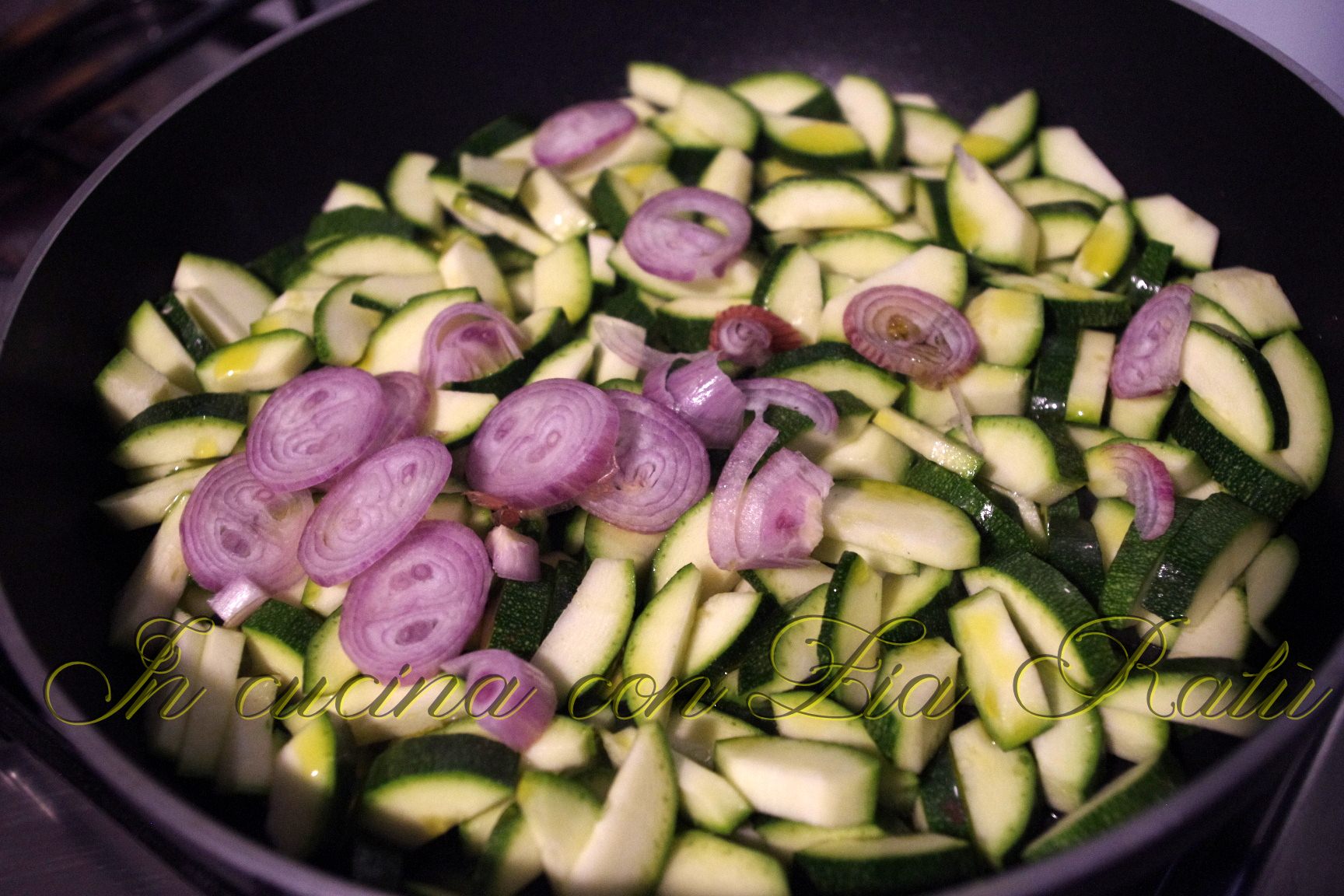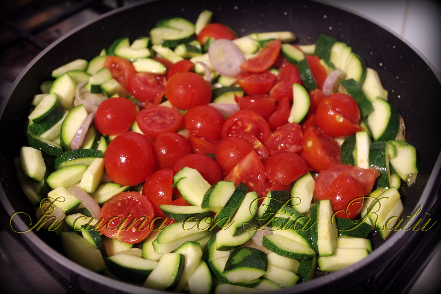 Lavate le zucchine e tagliatele in quattro parti in senso verticale. Togliete la maggior parte della parte bianca e poi tagliatele a pezzetti. Pulite lo scalogno e tagliatelo a fettine sottili. Lavate i pomodorini e tagliateli a metà. In una padella mettete un cucchiaio di olio evo, lo scalogno e le zucchine e fate cuocere a fuoco vivo per qualche minuto. Aggiungete poi i pomodorini, salate e fate cuocere a fuoco basso per 10 minuti coprendo la padella con un coperchio.
