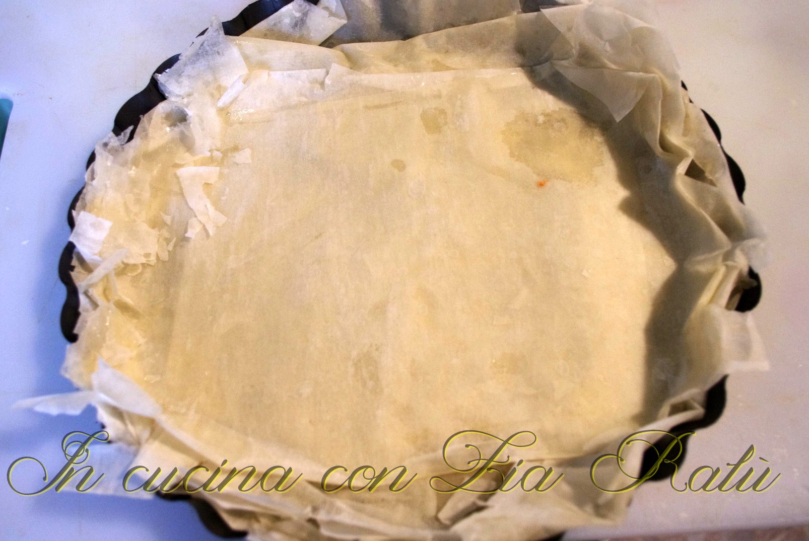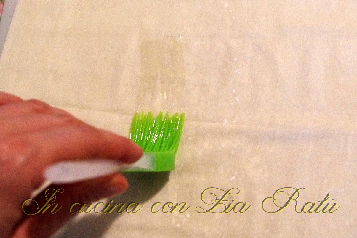 Prendete una teglia da crostata e iniziate a creare la base. Ungete ogni foglio di pasta fillo con un po’ di olio di semi. Chiudete ogni foglio a metà e rivestiteci la teglia mettendo ogni foglio con un angolo di circa 45° sul precedente. Accendete il forno a 180°.