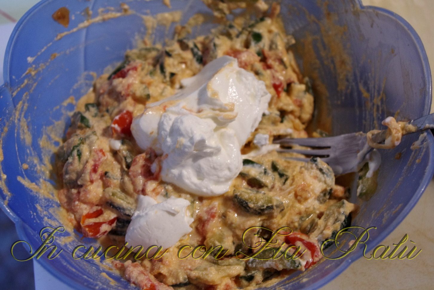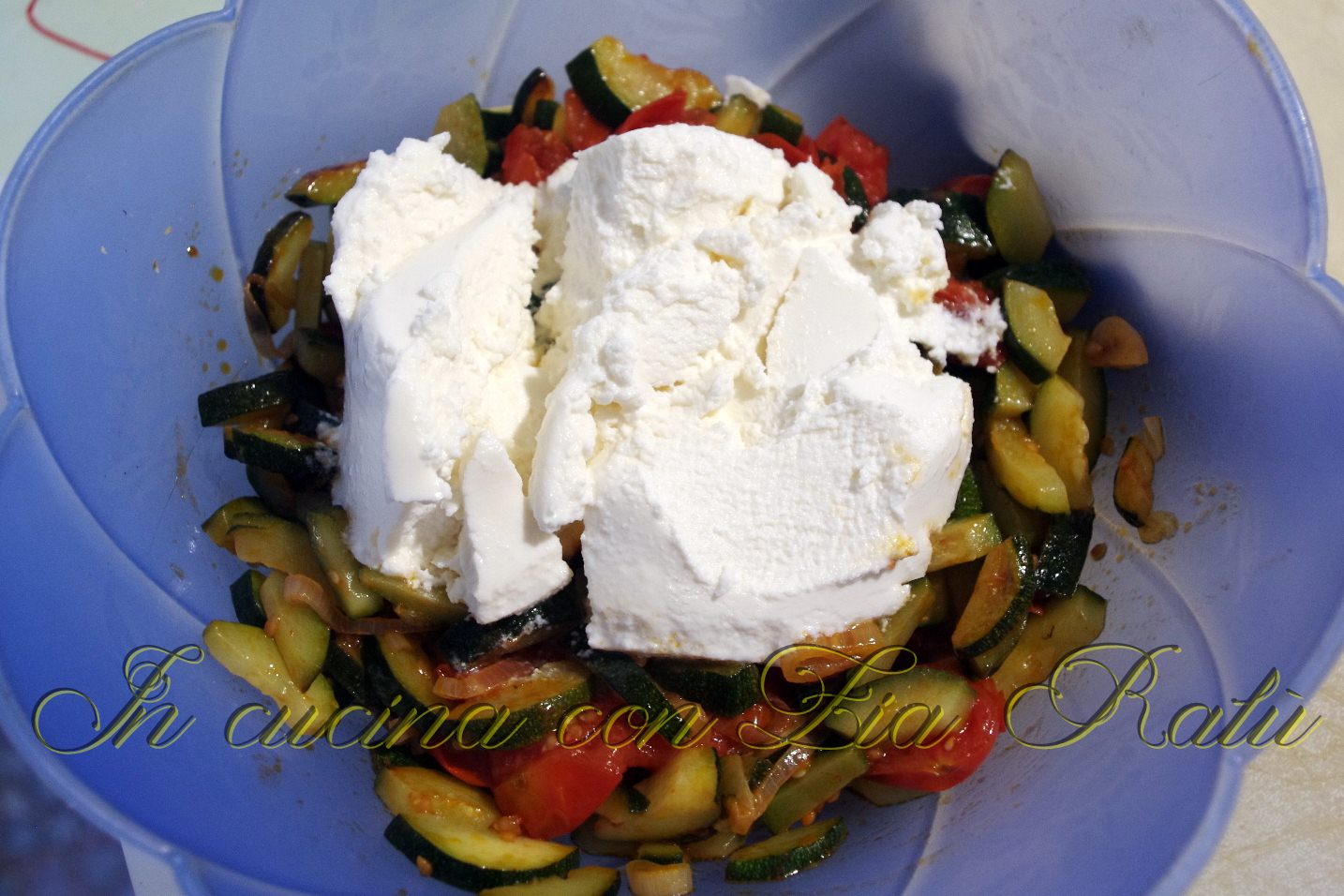 Quando le zucchine saranno cotte fatele raffreddare e poi mettetele in una ciotola. Aggiungete la ricotta alle verdure e mescolate, aggiungete poi lo yogurt greco e amalgamate bene il tutto.